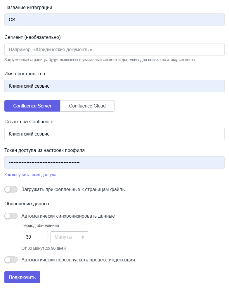 Интеграция позволяет загружать данные из Confluence в базу знаний, автоматически синхронизировать и переиндексировать их.