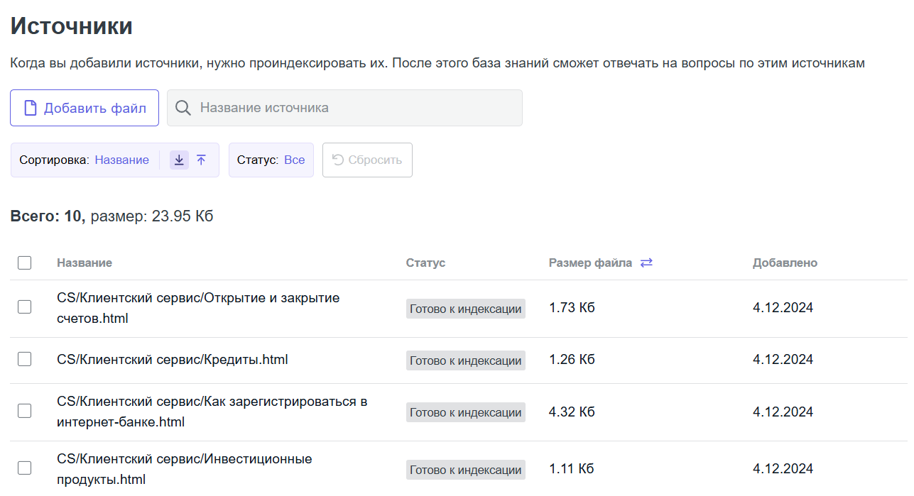 После загрузки данных нужно проиндексировать базу знаний.
