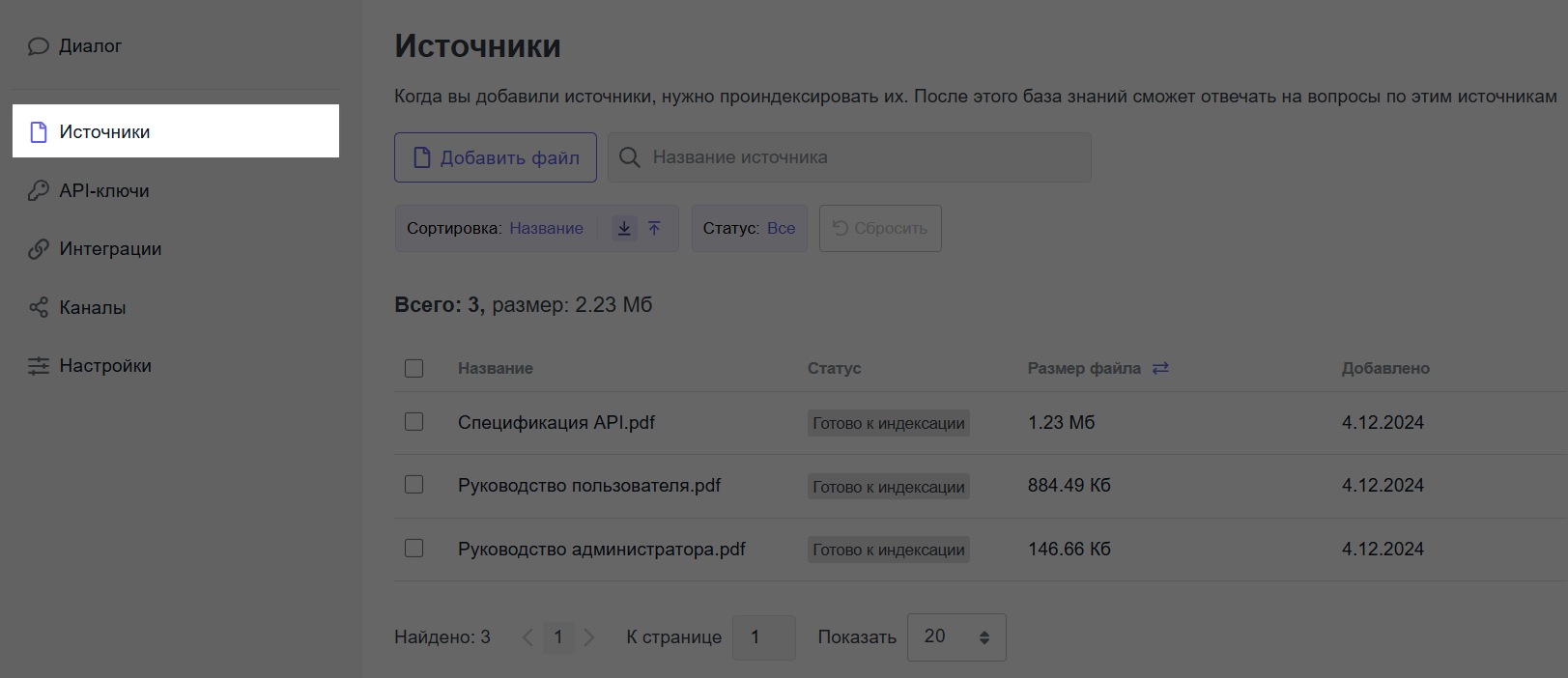 - Проверьте, что файлы не содержат конфиденциальную информацию. Все загруженные данные будут доступны для индексации и использования. Ваши клиенты или сотрудники смогут получить к ним доступ, когда будут обращаться к базе знаний.